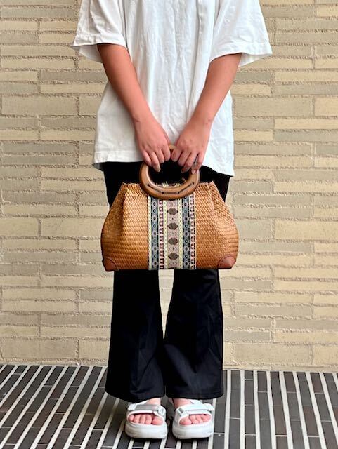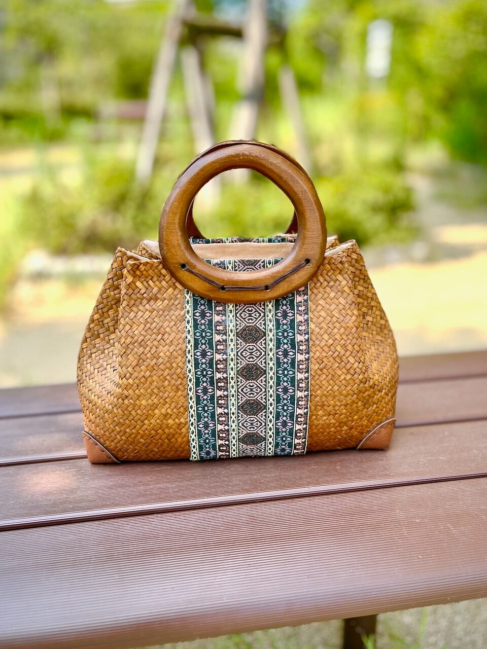 大人っぽい雰囲気が漂う、木製ハンドルのかごバッグです。中央には美しい紋様が施されておりシンプルながらも存在感があります。丸く膨らみのある形がかわいい。和装に合わせてもステキです。